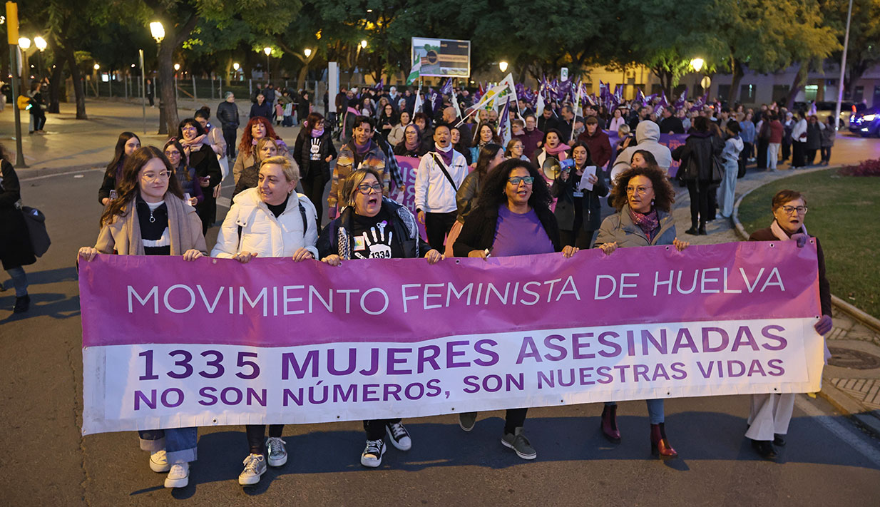 Cerca de medio millar de personas participaron ayer en la manifestación organizada por el Movimiento Feminista de Huelva que volvió a manifestarse este martes, 25 de noviembre, Día Internacional contra las Violencias Machistas, bajo el lema ‘1.334 mujeres asesinadas. No son números, son nuestras vidas’. La manifestación partió a las 18:30 horas desde la rotonda de los bomberos y finalizó en plaza del Ayuntamiento con la lectura del manifiesto.