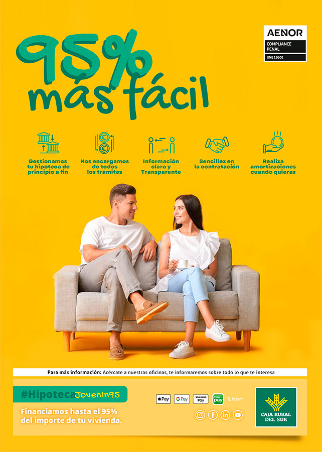Caja Rural del Sur, para ayudar a los jóvenes de hasta 35 años a la compra de su primera vivienda o vivienda habitual, ha comenzado la comercialización de la “Hipoteca Joven 95%”. La entidad financiera refuerza así su apuesta por los jóvenes para facilitarles la financiación de hasta el 95% del importe de la compra de vivienda, con el objetivo de que puedan acceder más cómodamente a la operación financiera con un menor desembolso inicial que en una hipoteca habitual.