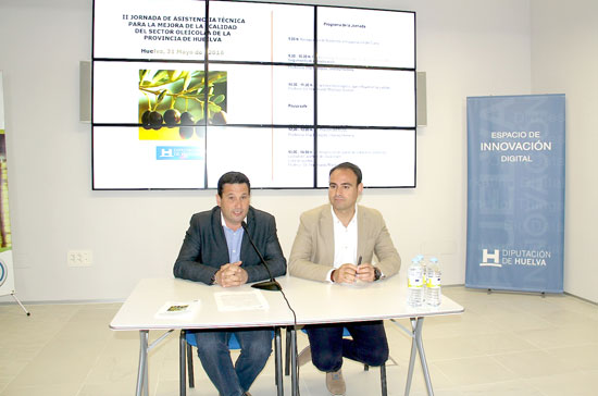El diputado de Agricultura de la Diputación de Huelva, Ezequiel Ruíz y el delegado de la Consejería de Agricultura, Pesca y Desarrollo Rural de la Junta de Andalucía en Huelva, Pedro Pascual, han inaugurado las II Jornadas de Asistencia Técnica para la Mejora de la Calidad del Sector Oleícola de la Provincia de Huelva, organizadas por la Diputación de Huelva, desde el servicio de investigación agrícola y ganadero.
