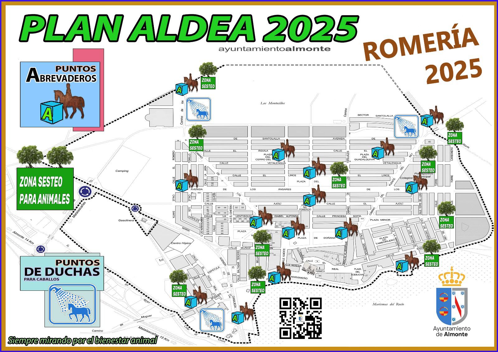 Conscientes del impacto que puede tener el calor previsto este año en los animales durante la romería, se han habilitado 15 puntos de abrevadero distribuidos por toda la aldea, así como zonas de sombreo y plazas abiertas al descanso animal, especialmente pensadas para las horas de mayor exposición solar. Además, se han dispuesto duchas para caballos en los accesos de El Rocío, facilitando su hidratación y bienestar al llegar del camino.