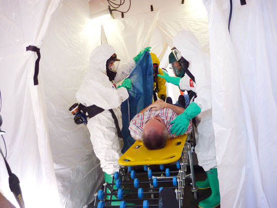 En este tipo de incidentes resulta fundamental que previamente a la asistencia sanitaria que pudieran precisar, las víctimas sean aisladas y permanezcan en una determinada área para proceder a su descontaminación. De ahí que se utilice un dispositivo y un material específico para equipar a los profesionales que los atienden. Con ello se evita que, ante una hipotética situación real, la contaminación se propague por el interior de las instalaciones hospitalarias y provoque la paralización de diferentes actividades sanitarias.