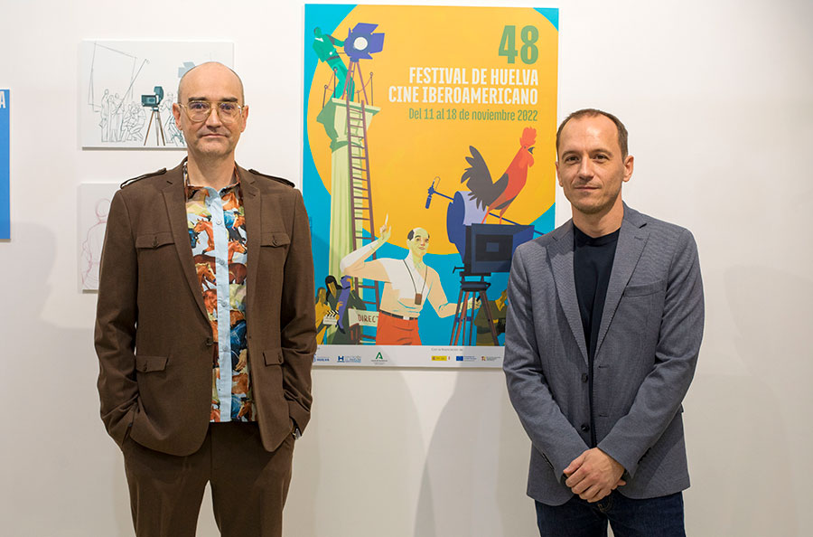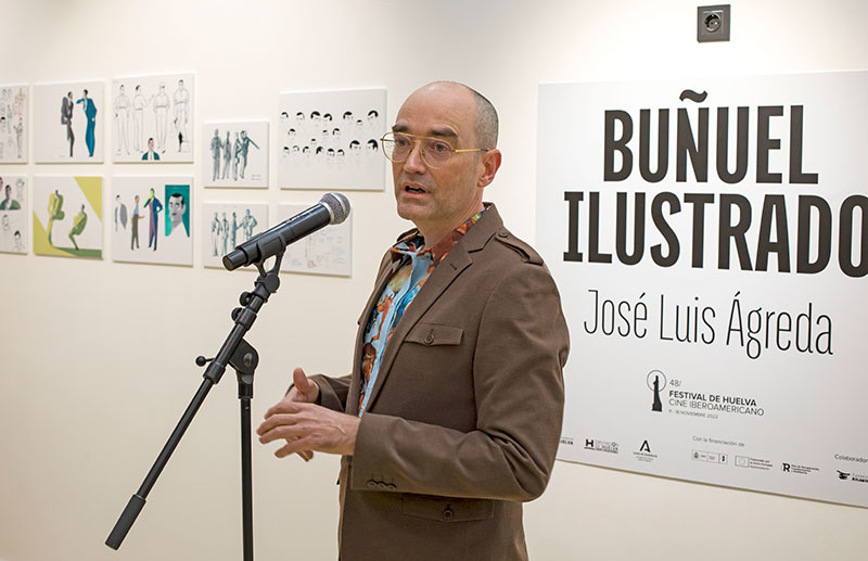 Durante el acto de inauguración de la muestra, en el que ha estado acompañado por Manuel H. Martín, director del Festival de Huelva, Ágreda ha explicado que a la hora de crear el cartel de la 48 edición buscó reflejar “la luminosidad y el color tanto de Huelva como de Iberoamérica” así como hacer reconocible la figura de Buñuel. Tras explicar las líneas generales sobre las que se articula esta exposición, Ágreda ha agradecido al equipo del certamen onubense el uso que ha hecho de los elementos del cartel para dar cuerpo a la imagen gráfica de la edición de este año.