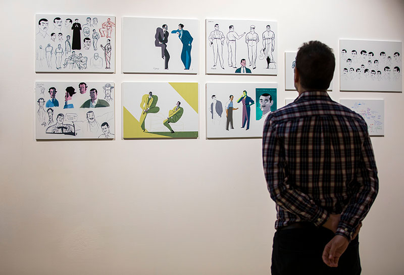 Entre las piezas incluidas en la exposición ‘Buñuel ilustrado’ se encuentran también los diseños previos para los personajes principales de la película animada sobre Buñuel y curiosidades como la felicitación navideña creada para el equipo de la película; el diseño en estilo cartoon para un cortometraje alternativo que hizo el equipo de arte; y una ilustración para la revista ‘Academia’ hecha tras ganar el premio Goya a la Mejor Película de Animación.