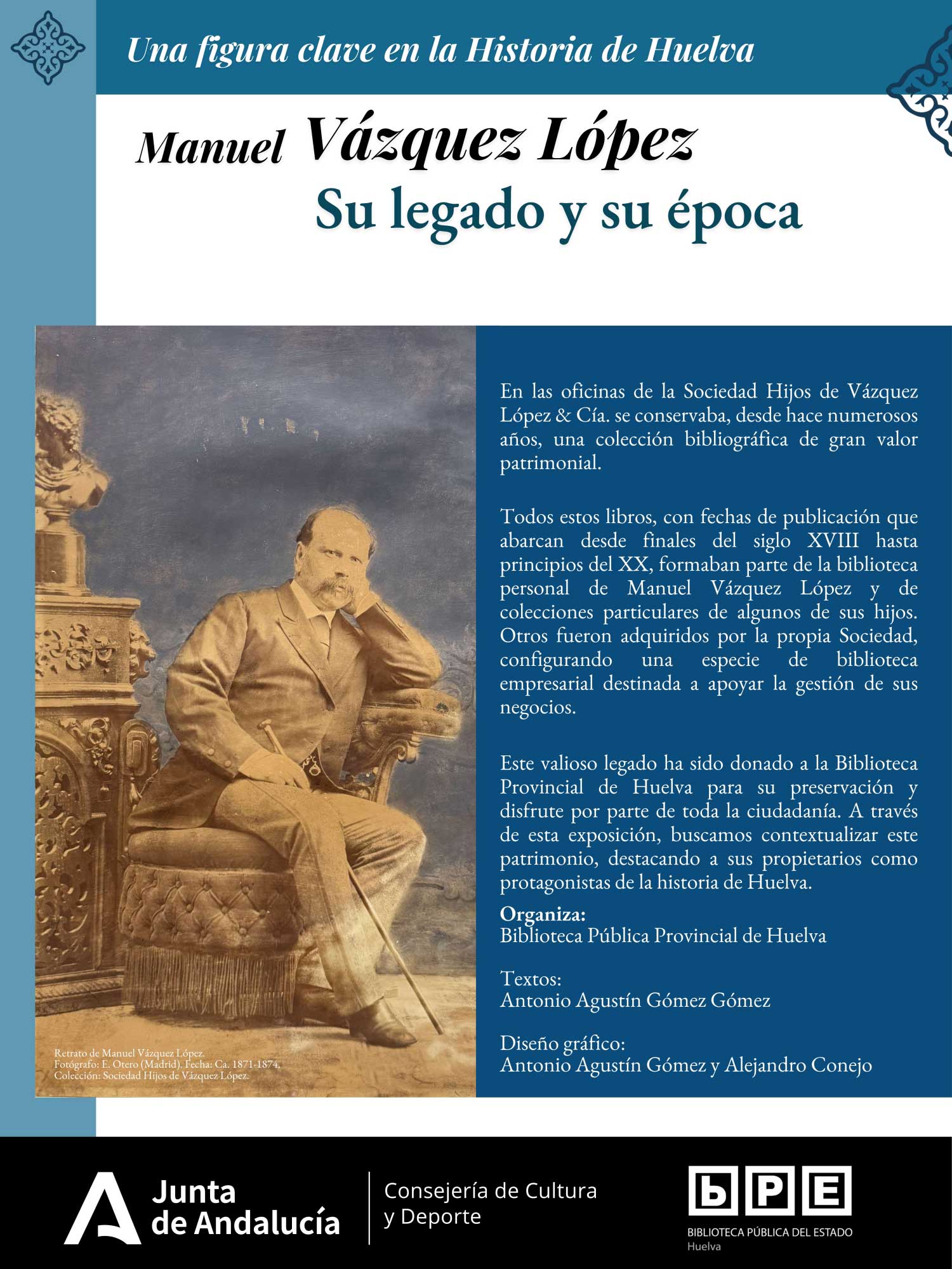 En este marco se destaca que la exposición, elaborada por la propia Biblioteca Provincial tras meses de trabajo, reúne doce paneles de gran formato y una selección de libros pertenecientes a la biblioteca familiar de Manuel Vázquez López y sus descendientes. Esta colección, donada a la Biblioteca en mayo de este año tras su aprobación oficial en el Boja, constituye un valioso patrimonio que documenta la vida, época, y la aportación política, económica y social de Vázquez López, quien fue diputado, senador y presidente de instituciones clave como la Junta de Obras del Puerto y la Cámara de Comercio durante un periodo histórico en el que Huelva se conocía como «la California del Cobre».