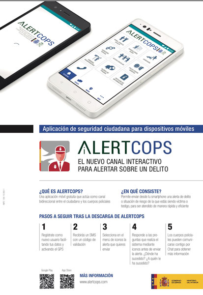 Desde la Guardia Civil se recomienda a todos los ciudadanos el uso de la Aplicación Alertcops, ya que mediante este sistema, cualquier persona a través de su dispositivo móvil puede enviar una alerta directamente a los cuerpos policiales (Policía y Guardia Civil) de una forma sencilla e intuitiva con el fin de ser atendido de manera rápida y eficiente. El servicio Alertcops consta de una aplicación móvil que se instala en cualquier terminal móvil Smartphone a través de Google Play o de la App Store.