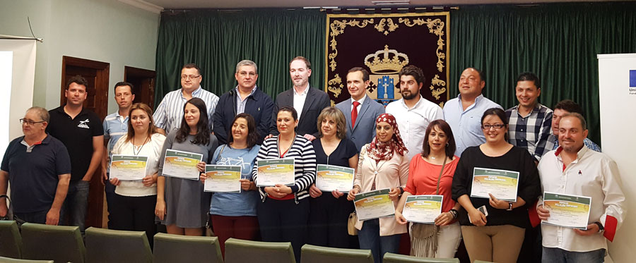 El delegado territorial de Economía, Innovación, Ciencia y Empleo, Manuel Ceada, junto al alcalde de Villalba del Alcor, Sebastián Fernández, participó ayer en un reconocimiento realizado por la Junta de Andalucía a 17 emprendedores de la localidad en un acto en el que se presentarán a las empresas galardonadas a las que se les ha entregado un diploma.