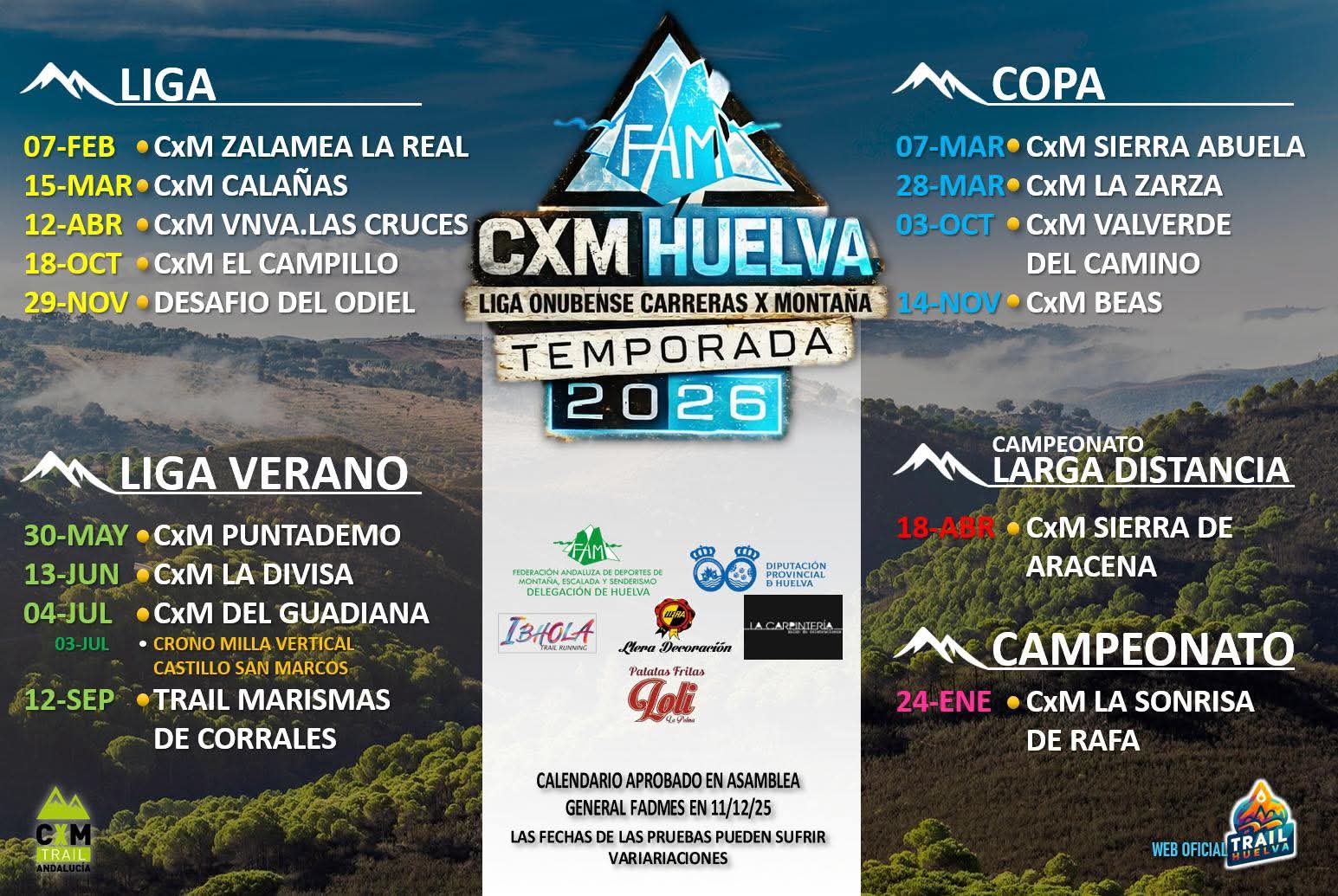 Por su parte, la Copa CxM Huelva se inicia con la Carrera Sierra Abuela, el 7 de marzo, para continuar el 28 de marzo en La Zarza; el 3 de octubre en Valverde del Camino y el 14 de noviembre en Beas.
