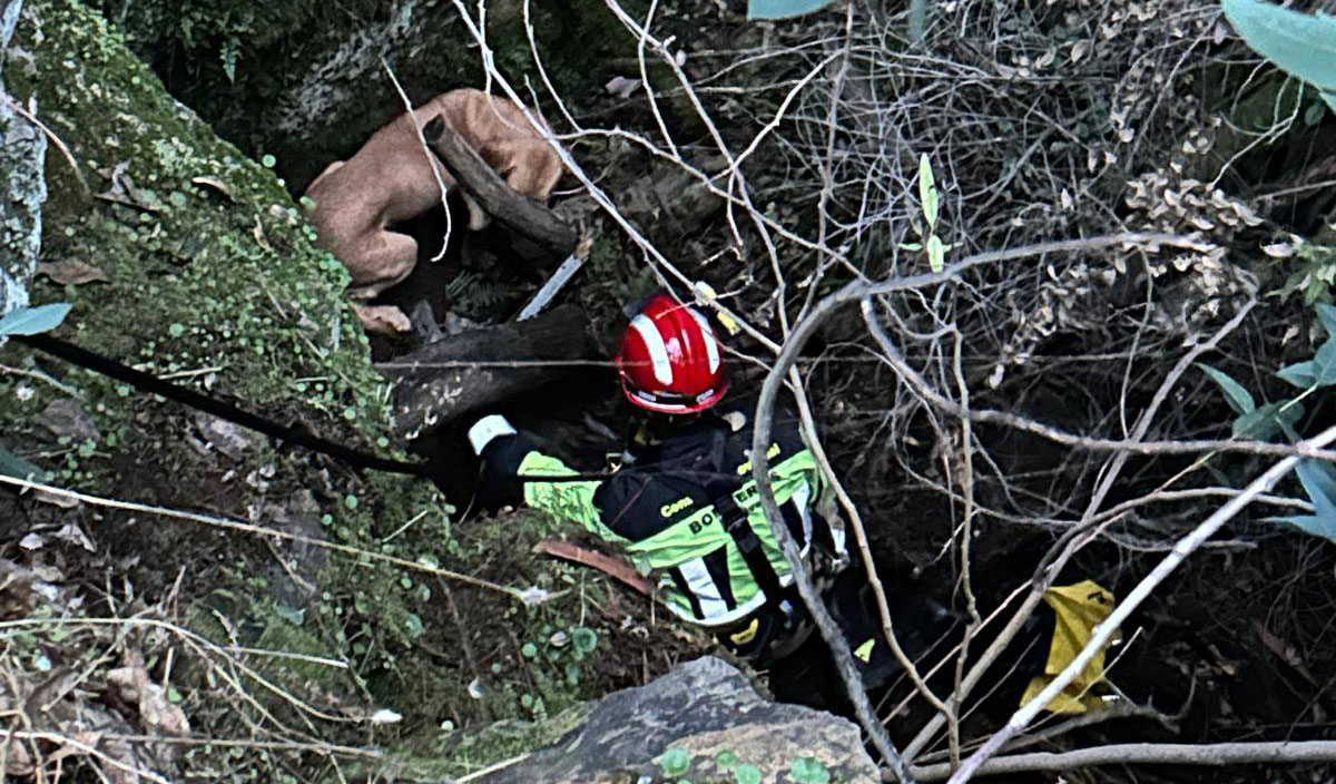 Los bomberos del Consorcio Provincial Bomberos Huelva del parque de Valverde del Camino, intervinieron la pasada semana en el rescate de Zeus, un perro que cayó a una sima de 10 metros, en la zona de la «Peña Geraldo».