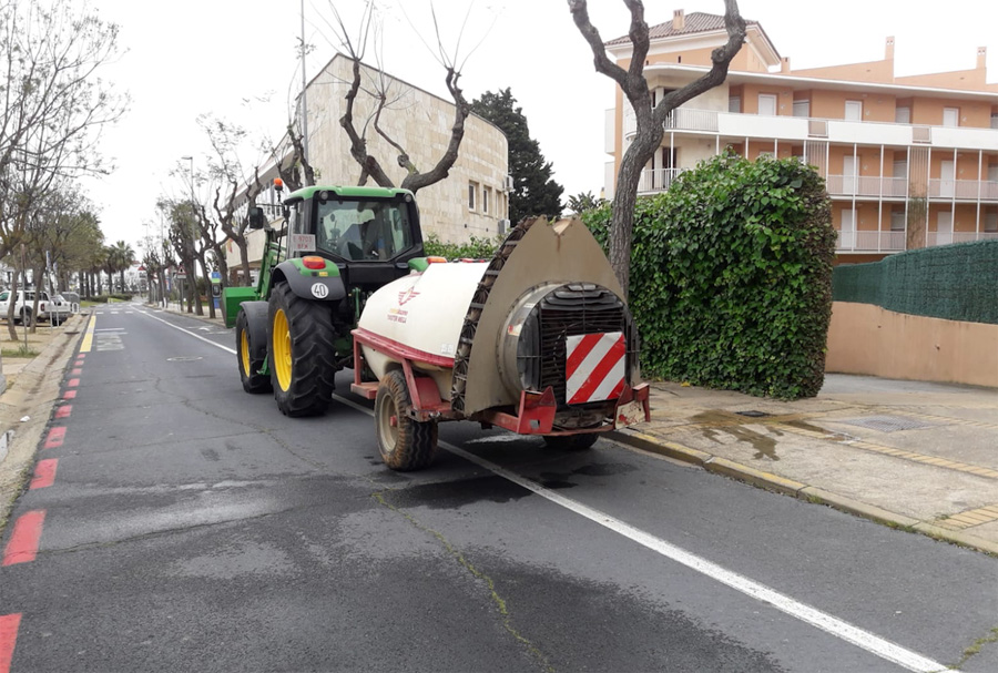 El equipo humano del Servicio de Mantenimiento de la Mancomunidad, compuesto por una docena de trabajadores organizados por turnos en cuadrillas, ejecutan esta tarea diariamente para minimizar en Islantilla el riesgo que supone cualquier posible presencia del coronavirus en el enclave.
